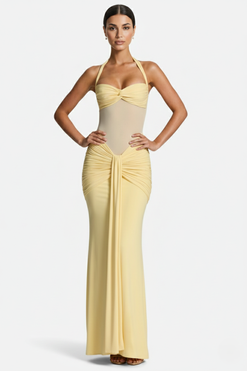 Halter Neck Tie Back Ruched Bodycon Evening Gown